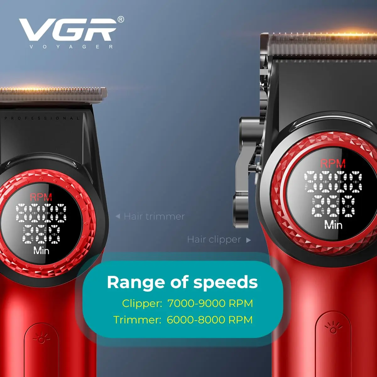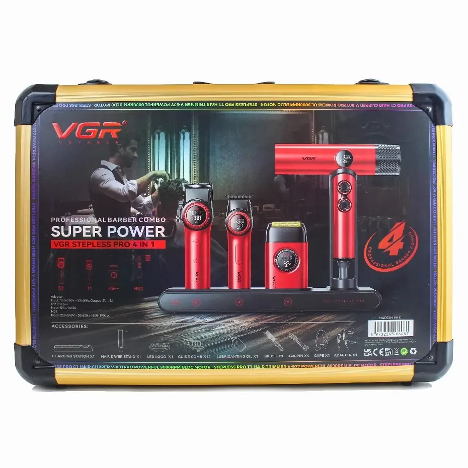 The VGR Mr. SUPER POWER Stepless Pro 4-in-1 Barber Set - the ultimate toolkit for barbers and premium users. This set includes a high-performance hair clipper (4600mAh) with ceramic blades, a trimmer (2500mAh) with DLC-coated blades, a foil shaver (1400mAh) with dual titanium foils, and a hair dryer with a powerful 110000 RPM BLDC motor. Each tool offers stepless speed control, LED displays, and long runtimes (up to 300 mins) for precision and versatility. Comes complete with multiple guide combs, magnetic dryer attachments, LED spotlight, charging base, dryer stand, and a luxury storage suitcase. Perfect for salon, travel, or home use-engineered for power, style, and reliability. With a one-year warranty and sleek red design, itβs the perfect fusion of performance, durability.